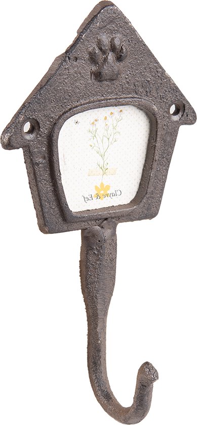 Decoratieve bruine ijzeren wandhaak / fotolijst in de vorm van een hondenhok, in een landelijke stijl, van het merk Clayre & Eef. Afmeting foto 5×5 cm. Hangend: alleen verticaal.