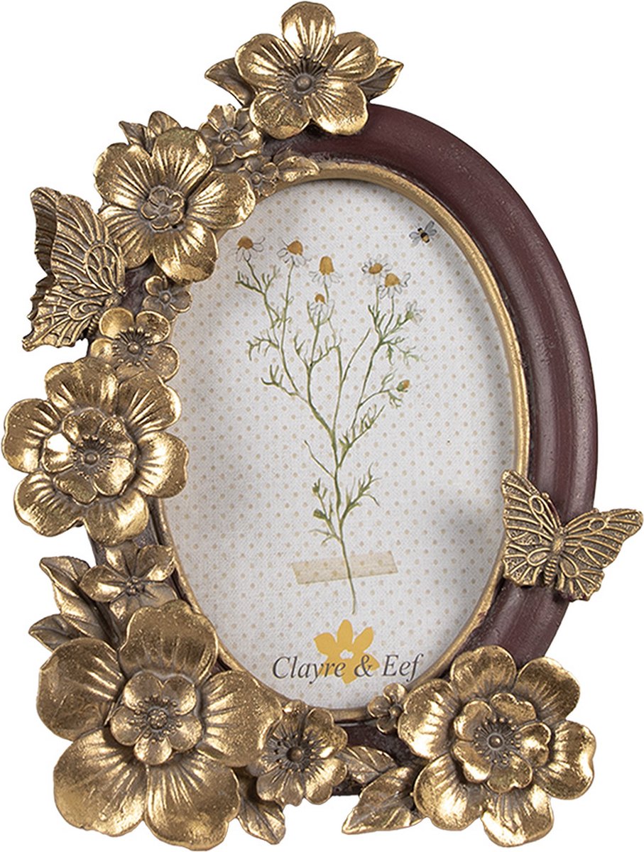 Decoratieve goudkleurige, ovale fotolijst met bloemenmotief. Deze lijst kan staand verticaal worden gebruikt. Het is een prachtige decoratie voor elk interieur.