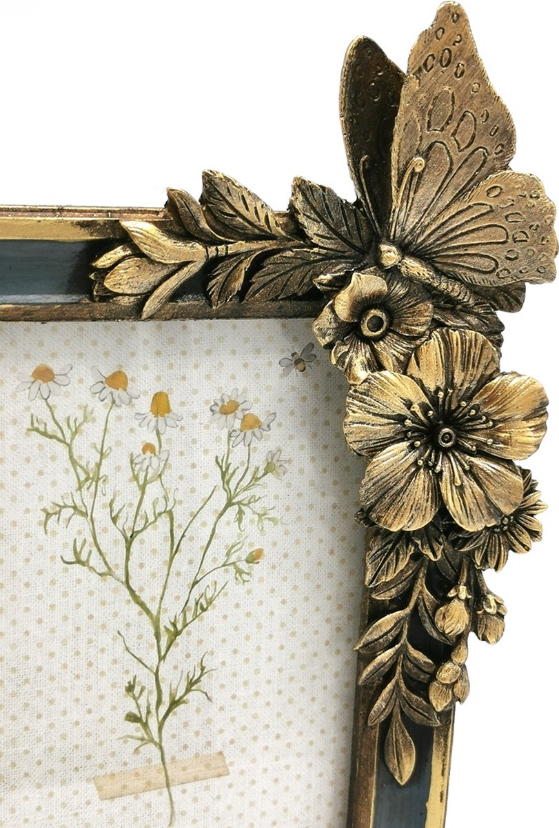 Decoratieve groene fotolijst afgewerkt met bloemenmotief. Deze lijst kan staand in een verticale positie worden geplaatst. Het is een prachtige decoratie voor elk interieur.