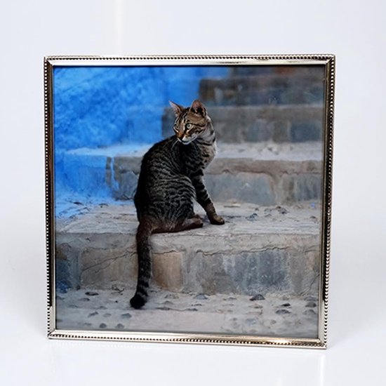 Deze verzilverde fotolijst heeft een parelrandje en staat prachtig op een bijzettafel.