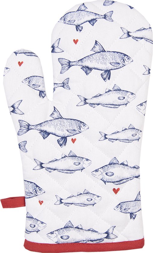 Mooie landelijke witte katoenen ovenwant met blauwe vissen in een maritieme stijl van het merk Clayre & Eef.