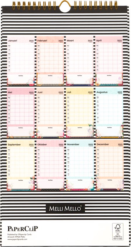 De Melli Mello familieplanner 2023 is perfect voor elke georganiseerde familie! Door de prachtige onderwaterwereld op de cover is het een echte eyecatcher op je keukentafel, koelkastdeur of wc. Door de gekleurde vissen op de cover tussen de tropische groene, roze, gele en rode waterplanten zie je deze planner absoluut niet over het hoofd. De gouden accenten maken het geheel een lust voor het oog. De kaft heeft niet alleen een prachtig design, ook de binnenkant is helemaal gemaakt in Melli Mello stijl en elke maand heeft een ander prachtig design. De familie agenda is gemaakt met oog voor ieder individu in het gezin, er is genoeg ruimte voor iedereen om dagelijks afspraken en plannen op te schrijven. De planner heeft een harde achterkant waardoor je gemakkelijk kunt schrijven op ieder oppervlak. En ook aan de pen is gedacht, deze zit aan de kaft vast zodat je ‘m niet kwijt kunt raken! Het formaat van de family planner is 39×21 cm.